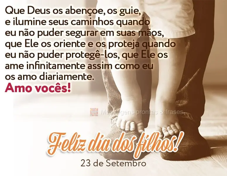 Que Deus os abençoe, os guie e ilumine seus caminhos quando eu não puder segurar em suas mãos, que Ele os oriente e os proteja quando eu não puder protegê-los, que Ele os ame infinitamente assim como eu os amo diariamente. Amo vocês! Feliz dia dos filhos! 23 de Setembro