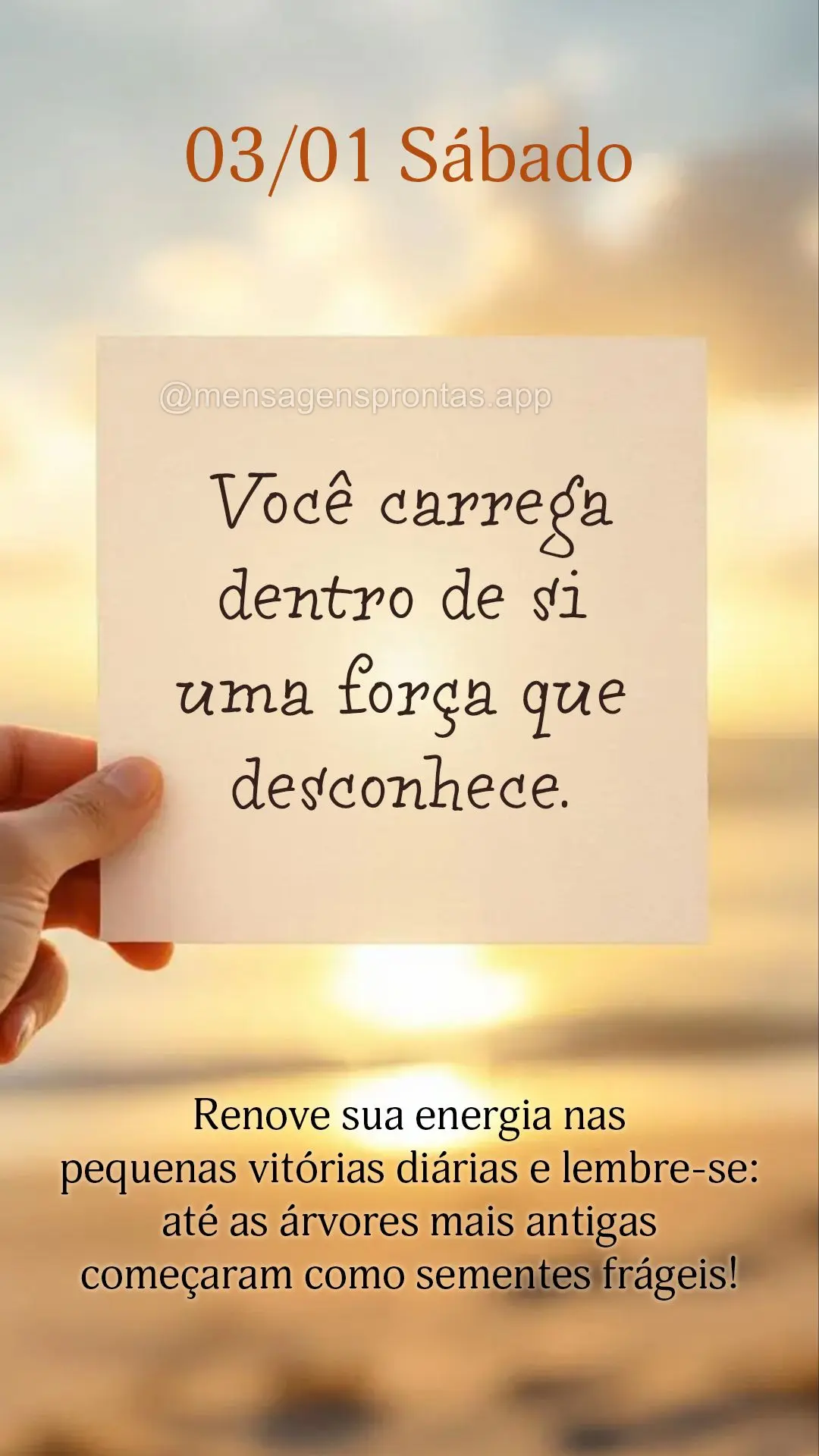 Você carrega dentro de si uma força que desconhece. Renove sua energia nas pequenas vitórias diárias e lembre-se: até as árvores mais antigas começaram como sementes frágeis. 03/01 Sábado